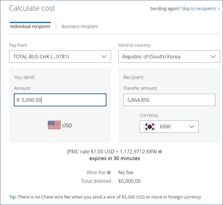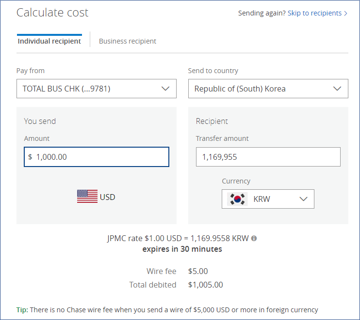 즉 체이스 송금 수수료를 정리하자면,