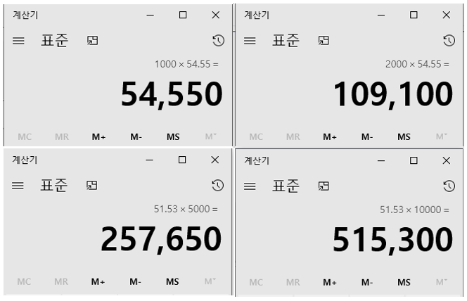 1,000달러, 2,000달러, 5,000달러, 10,000달러를 보냈을 때 환전 수수료가 얼마일지 계산해본 결과입니다. 금액이 커질수록 환전 손실이 더 커지게 되는데요. 체이스에서는 5,000달러 이상 송금을 하면 5달러 Wire Fee를 면제 해주지만 환전 스프레드 때문에 훨씬 더 큰 수수료를 내게 되는 꼴입니다.