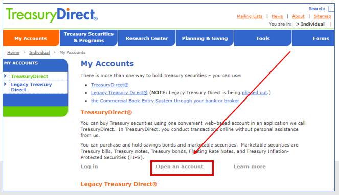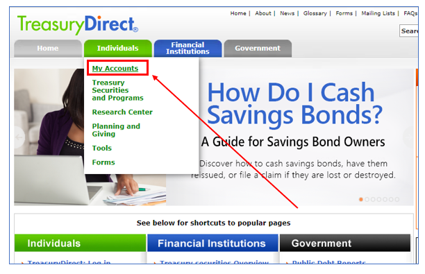 직접 미국 채권을 구입하려면 먼저 미국 재무부 사이트에 계좌를 개설해야 합니다. 사이트에서 Individuals 메뉴를 클릭하고 My Accounts 메뉴를 클릭해줍니다.