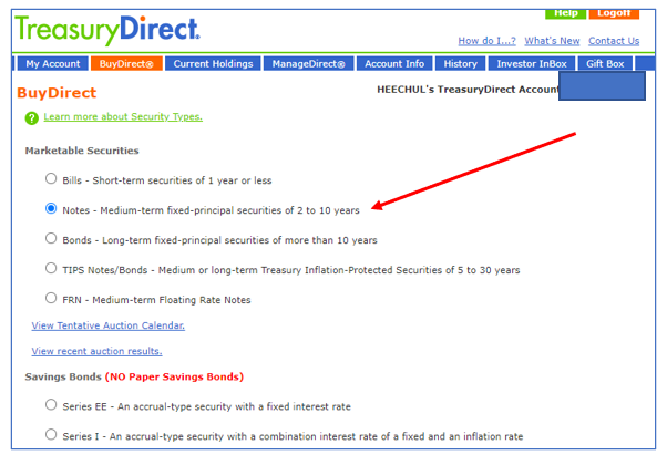 Product Term은 채권 만기를 의미합니다. 예를 들어 5년짜리를 선택하면 Auction Date(경매일)에 구입이 결정되고, Issue Date(발급일)에 은행에서 돈이 빠져나갑니다. 그리고 5년 후 만기일에 이자와 함께 다시 은행 계좌에 돈이 들어오게 되는데요. 쉽게 말해서 은행에서 돈이 빠져 나가면 우리가 미국 정부에 돈을 빌려준 것이고, 5년 후에 미국 정부가 우리에게 이자와 함께 빌려간 원금을 갚는 것입니다.