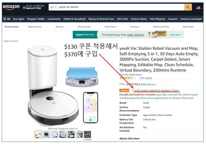 그래서 친구가 사용하던 로봇청소기 모델과 동일한 모델로 구입을 결심했습니다. 모델명은 Yeedi vac station이었습니다. 물걸레 겸용 + 자동 먼지 비움 + 스마트폰 제어 기능이 있고, 디자인도 흰색으로 깔끔하더군요. 참고로 자동 먼지 비움이 안되면 로봇청소기 자체 먼지통을 매번 갈아줘야 되서 엄청 귀찮다고 하네요. 마침 아마존에 들어가보니 $130달러 쿠폰 적용이 되고 있어서 $370에 구입했습니다.