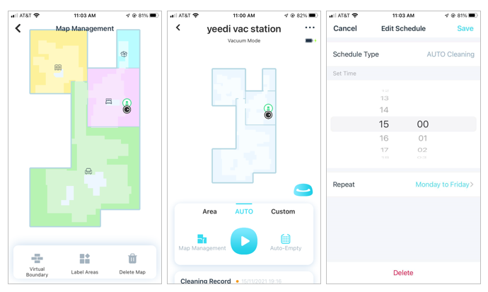 처음 Yeedi를 실행시키면 집안 구석구석 돌아다니면서 맵(map)을 만듭니다. 스마트폰 앱에서 맵을 확인할 수 있는데요. 맵에 구역을 설정해서 특정 구역만 청소하게 할 수도 있고, 스케쥴링해서 알아서 청소하도록 할 수도 있습니다.