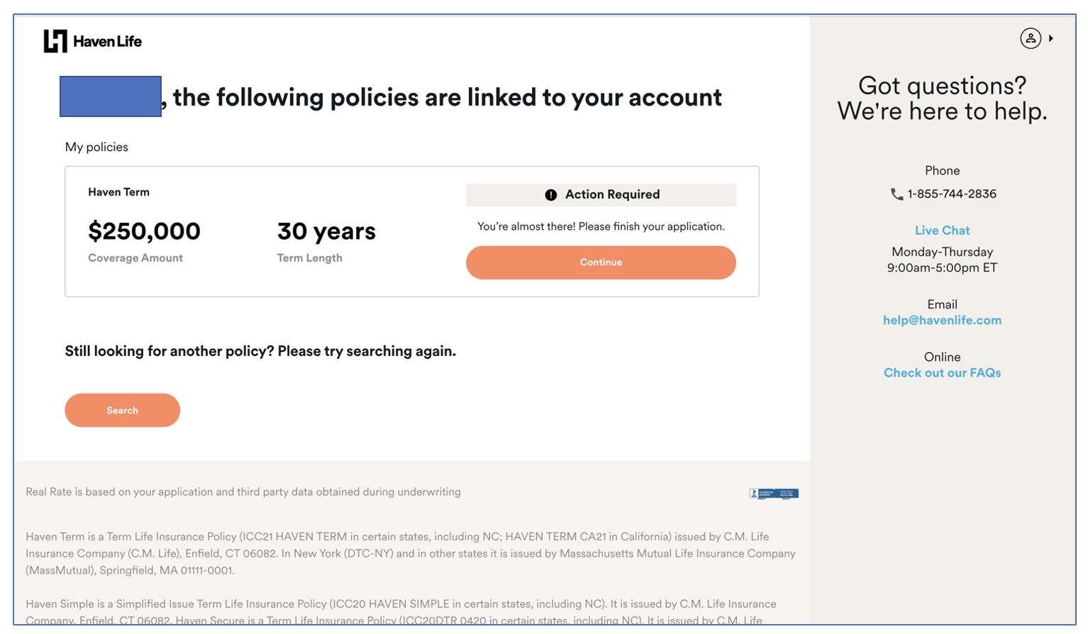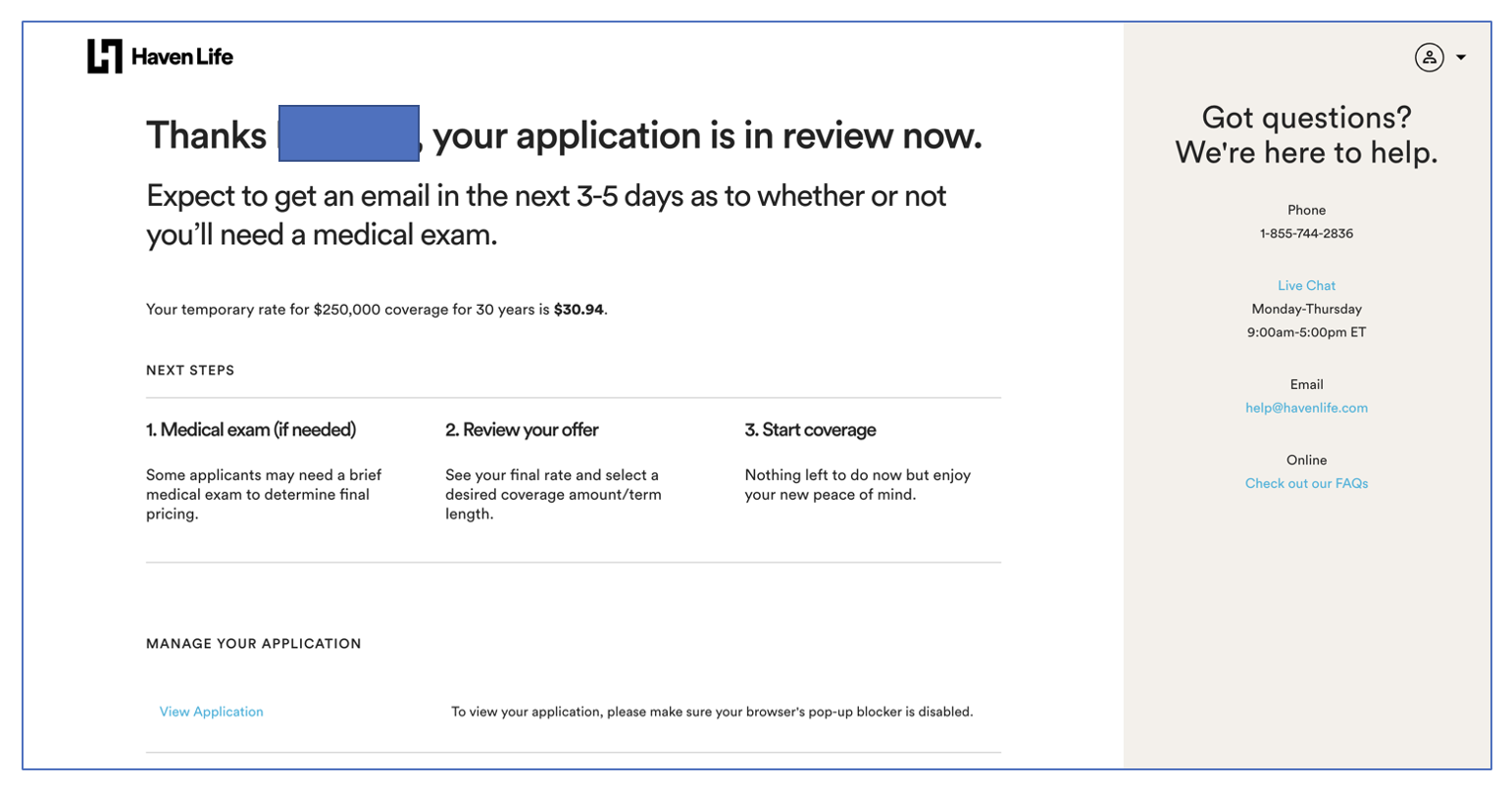 참고로, Haven Life에서는 2가지 종류의 텀 라이프 생명보험을 다루고 있는데요. 첫 번째가 Haven Term이고 두 번째는 Haven Simple입니다. Haven Term은 일반적인 텀 라이프 보험을 말하고, Haven Simple은 메디컬 Exam이 생략된 것을 말합니다. 일반적으로 메디컬 Exam이 생략된 Haven Simple이 더 비싸다고 하더군요. 그래서 저는 Haven Term 으로 진행하였습니다.