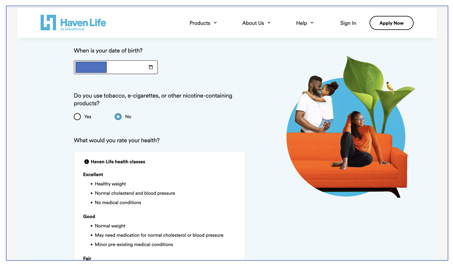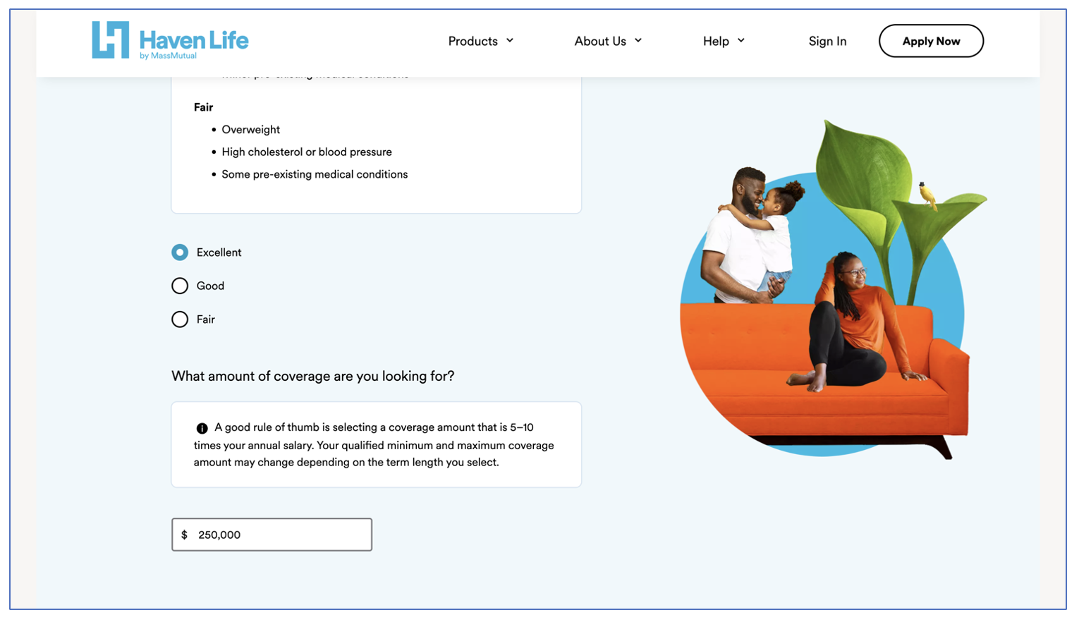 Haven Life는 미국에서 점유율 3위 정도(참고: 미국 생명보험 회사 순위)를 차지하고 있는 MassMutual(매스뮤츄얼)의 자회사이자 디지털 생명보험회사 입니다. 저는 Haven Life에서 20년과 30년 텀 라이프 생명보험에 가입하였는데요. Haven Life에 가입을 하려면 아래 그림처럼 우선 Haven Life 홈페이지에서 간단히 견적을 내는 것으로 시작합니다.
