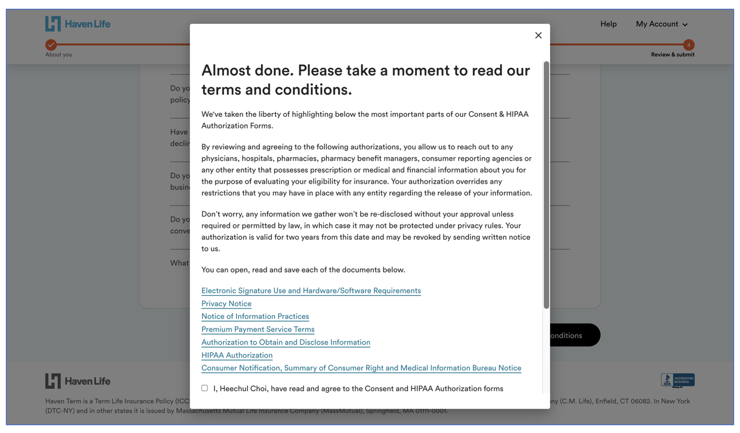 앞서 살펴본 바와 같이 전반적으로 Haven Life Term 신청 과정은 어렵지 않았습니다. 홈페이지 인터페이스도 깔끔하게 되어 있고, 시스템 오류나 입력에 불편함도 딱히 없었던 것 같더군요. 다만, 질문이 다 영어로 되어 있고, 질문 내용이 꽤 상세해서 의료 기록 등을 찾는데 꽤 시간이 걸렸던 것 같습니다. 하지만, 될 수 있으면 I don't know를 선택하는 것보다 최대한 솔직하고 정확하게 질문에 대해 답하는 것이 좋다고 하더군요.