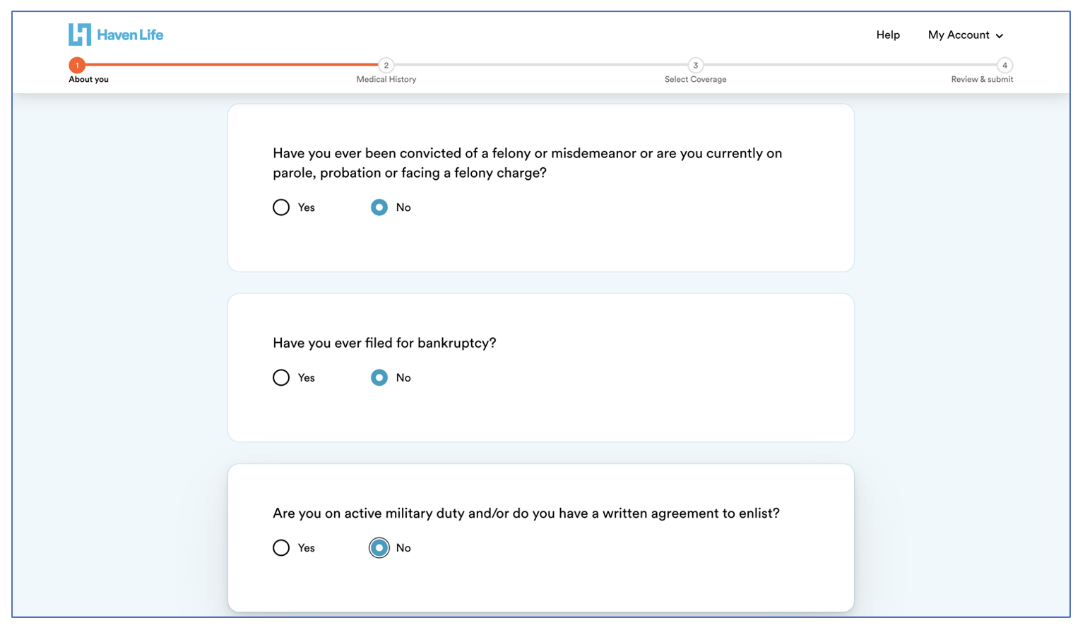 다음으로 중범죄를 저지른 적이 있는지, 파산 신청을 한 적이 있는지, 현재 군인이거나 군 입대를 앞두고 있는지 등을 묻습니다. 아마도 이런 경력이 있으면 보험에서 거부되거나 보험료가 크게 오를 수 있겠죠.